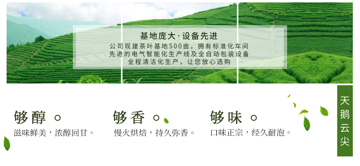 - 安徽天鵝茶業(yè)有限責(zé)任公司研制、生產(chǎn)、銷售“天鵝云尖”名綠茶歷史已達(dá)22年。現(xiàn)有總資產(chǎn)1700余萬元,其中固定資產(chǎn)900余萬元。公司現(xiàn)建茶葉基地500余畝,基地常年云霧繚繞。并擁有標(biāo)準(zhǔn)化車間、先進(jìn)的電氣智能化生產(chǎn)線及全自動(dòng)包裝設(shè)備,全程清潔化生產(chǎn)。公司在社會(huì)各界的關(guān)注幫助及員工的努力下,獲得了安徽省茶葉行業(yè)協(xié)會(huì)常務(wù)理事單位。“天鵝茶業(yè)”由安徽省農(nóng)業(yè)大學(xué)楊維時(shí)教授指導(dǎo)創(chuàng)制,并受到當(dāng)代茶圣陳椽教授的指點(diǎn)和親筆題名。1991年創(chuàng)牌,后榮獲中國(guó)農(nóng)業(yè)博覽會(huì)名(綠)茶金質(zhì)獎(jiǎng)。 公司依托天潤(rùn)茶業(yè)專業(yè)合作社建立緊密型茶園基地,以“客...