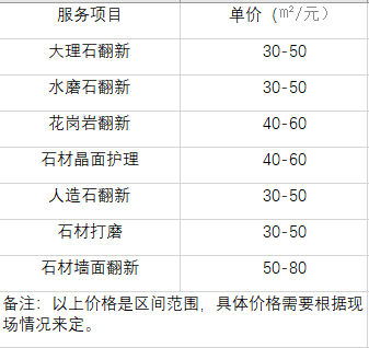 由于決定石材護(hù)理價(jià)格的因素較多,比如:石材安裝工藝如何?石材剪口大不大,也就是高低大不大等。還有與石材材質(zhì)有很大關(guān)系,同時(shí)也要看石材的材質(zhì)和石材的目前一個(gè)狀況來(lái)決定石材翻新的價(jià)格。因此價(jià)格要看實(shí)際現(xiàn)場(chǎng)才知道價(jià)格,以下給根據(jù)石材材質(zhì)情況,給出的價(jià)格參考。